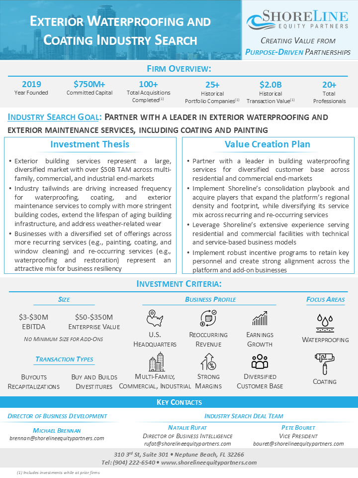 Neptune Beach, Florida – April 3, 2025 – Shoreline Equity Partners, a purpose-driven lower middle market private equity firm, is excited to launch a new search in the facilities services market focused on exterior waterproofing and maintenance services. The goal is to partner with a diversified platform that offers critical waterproofing, restoration, and coating services that address and preserve the building envelope. Target businesses meeting Shoreline‘s investment criteria can serve commercial or residential end-markets, should have recurring revenues across a fragmented customer base, and should focus on repairs and maintenance with limited new construction exposure. Shoreline has partnered with a buy-side search firm with strong relationships in the industry to support our efforts in finding a platform in the market.