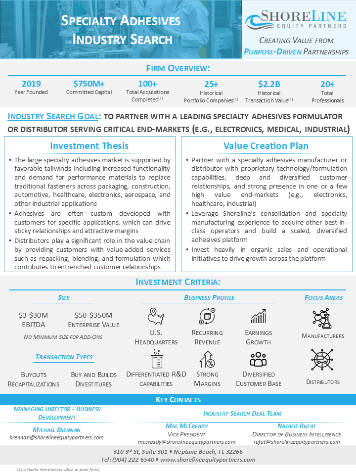 Neptune Beach, Florida – February 5, 2026 – Shoreline Equity Partners, a purpose-driven lower middle market private equity firm, has recently launched a new search in the CASE (coatings, adhesives, sealants, and elastomers) sector, focused on specialty adhesives. The goal is to partner with best-in-class specialty adhesives formulators or value-added distributors with deep customer relationships across critical applications and end-markets. Shoreline plans to leverage its expertise in M&A consolidation and specialty manufacturing to build scale and drive value creation across the platform.